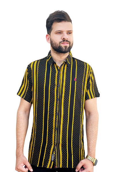 Black printed linen shirt half sleeve yellow lining