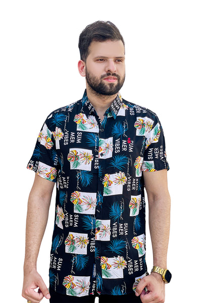 Black summer vibe printed linen half sleeve shirt