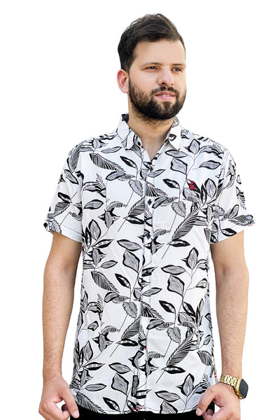 White leaves printed linen half sleeve shirt