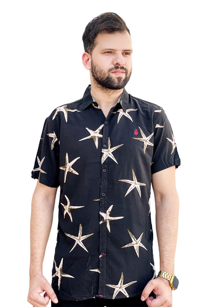 Black stars printed linen half sleeve shirt