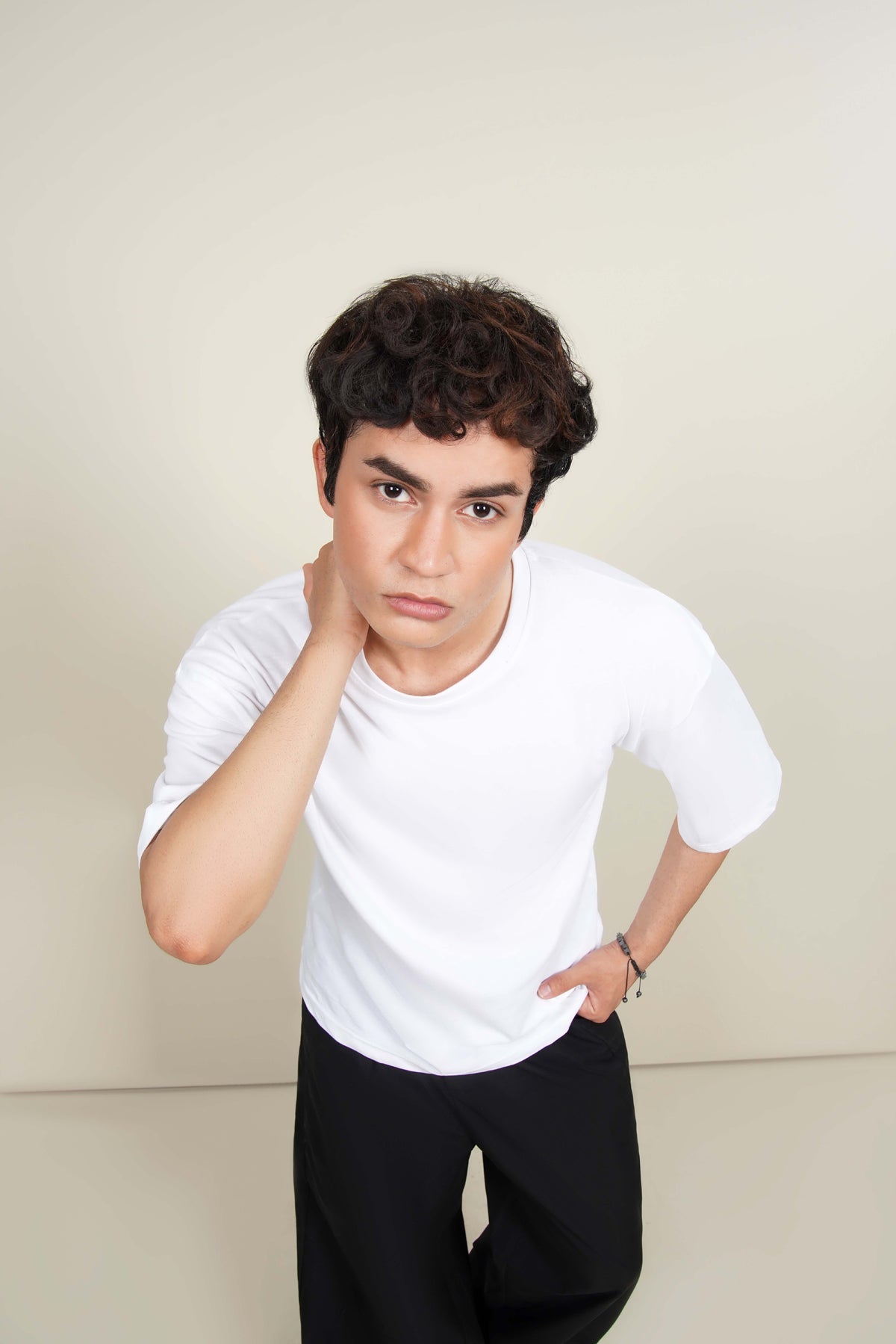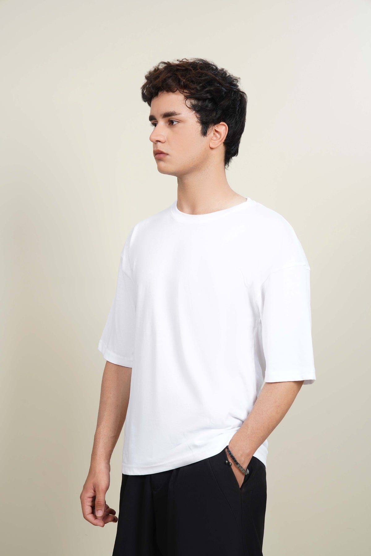 Relaxed fit drop-shoulder tee with half sleeves, soft breathable cotton, perfect for casual street style.